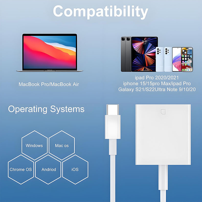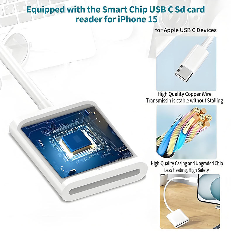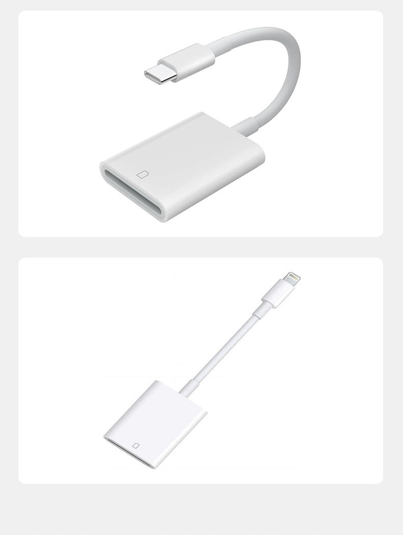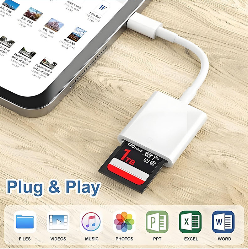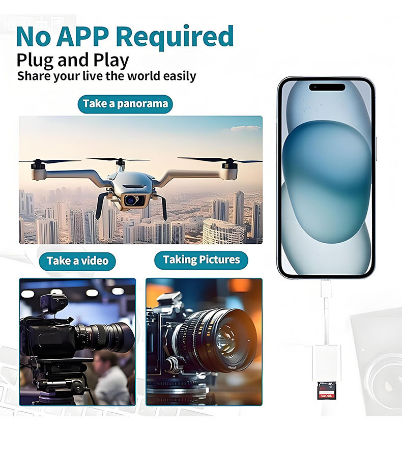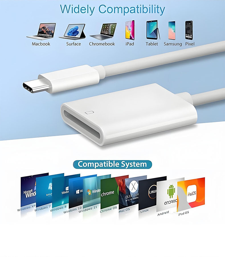 Universal Compatibility: Supports various devices including Apple phones, Sony, Canon, Nikon cameras, and memory cards.